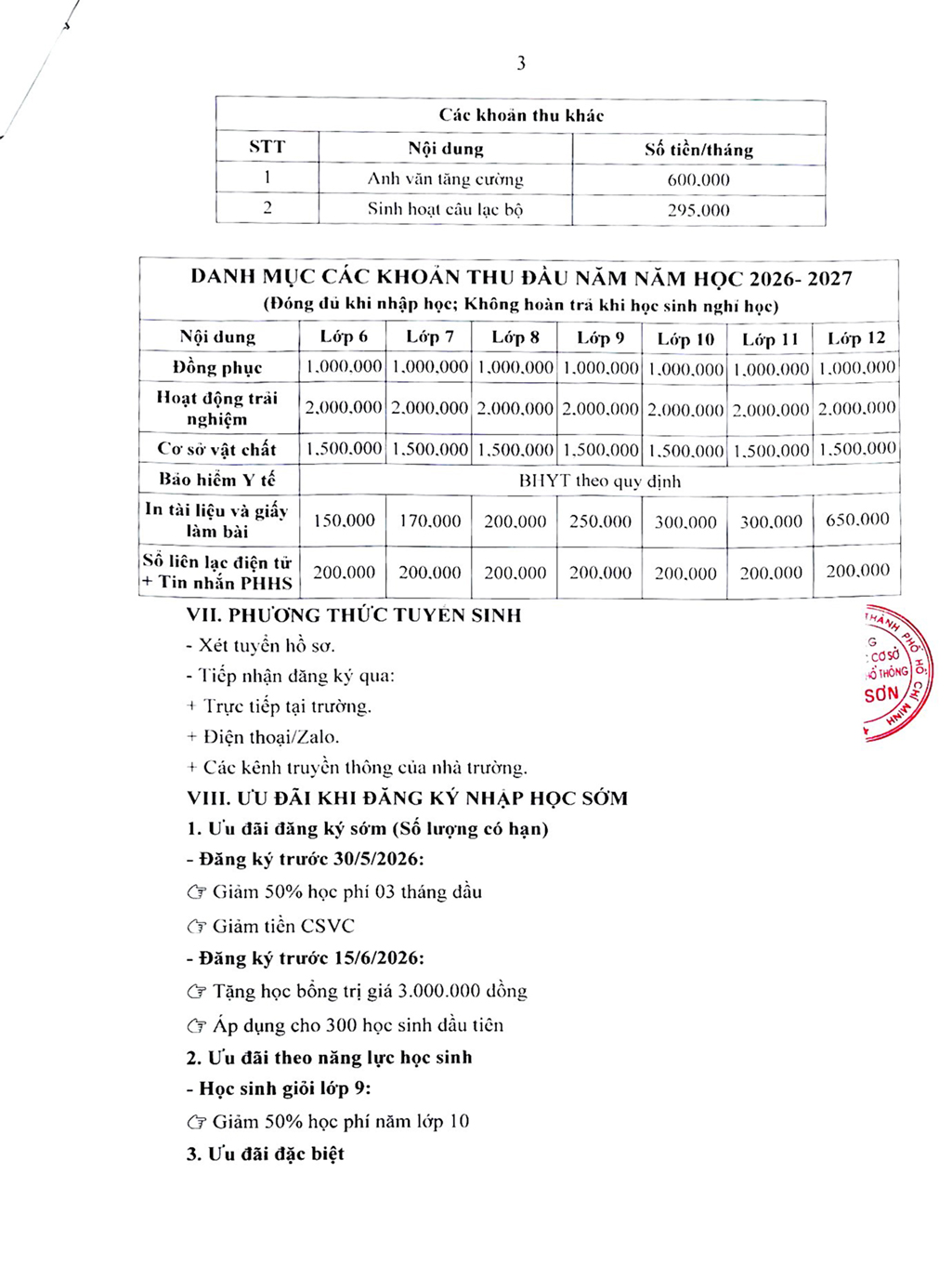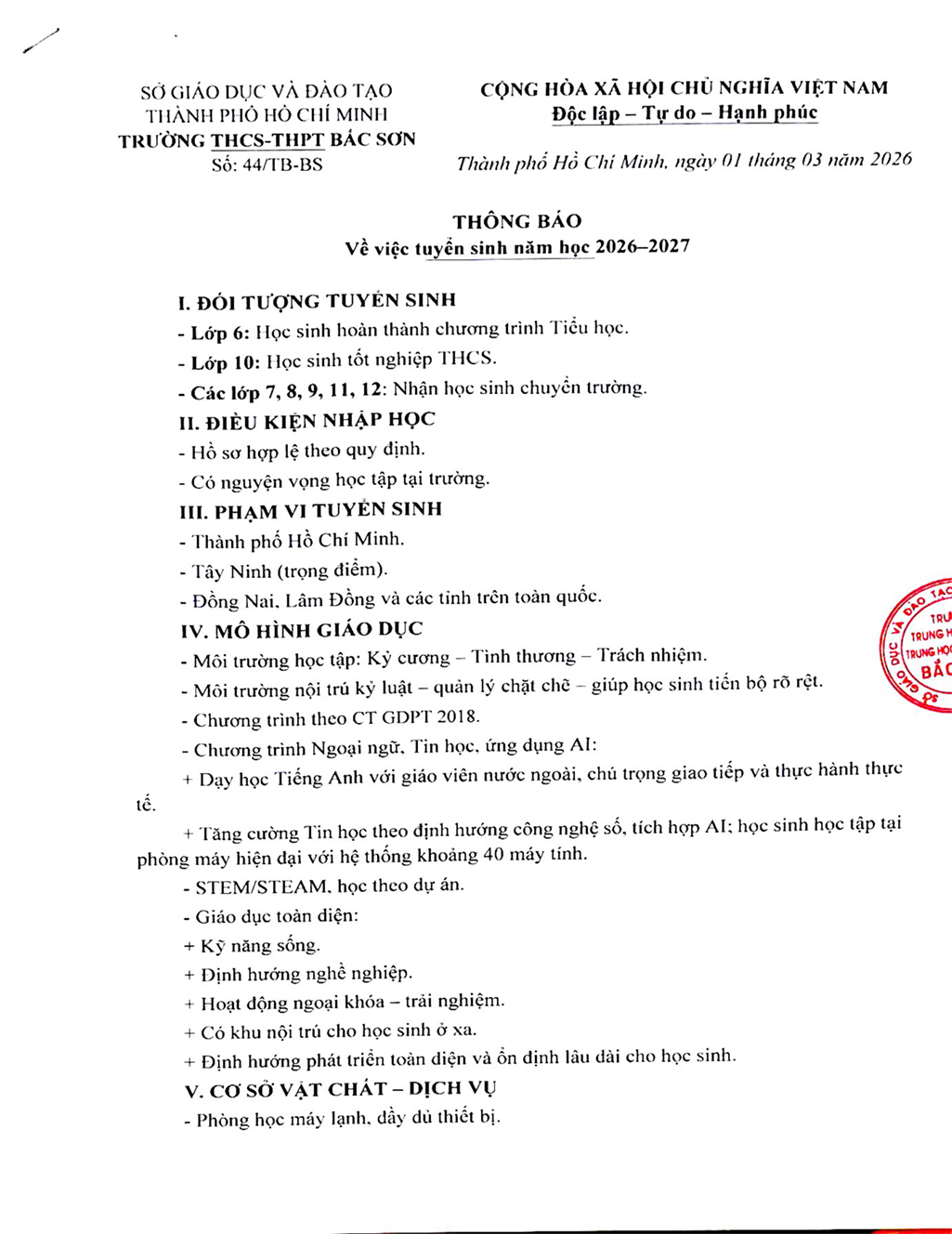Thông báo về việc tuyển sinh năm học 2026–2027