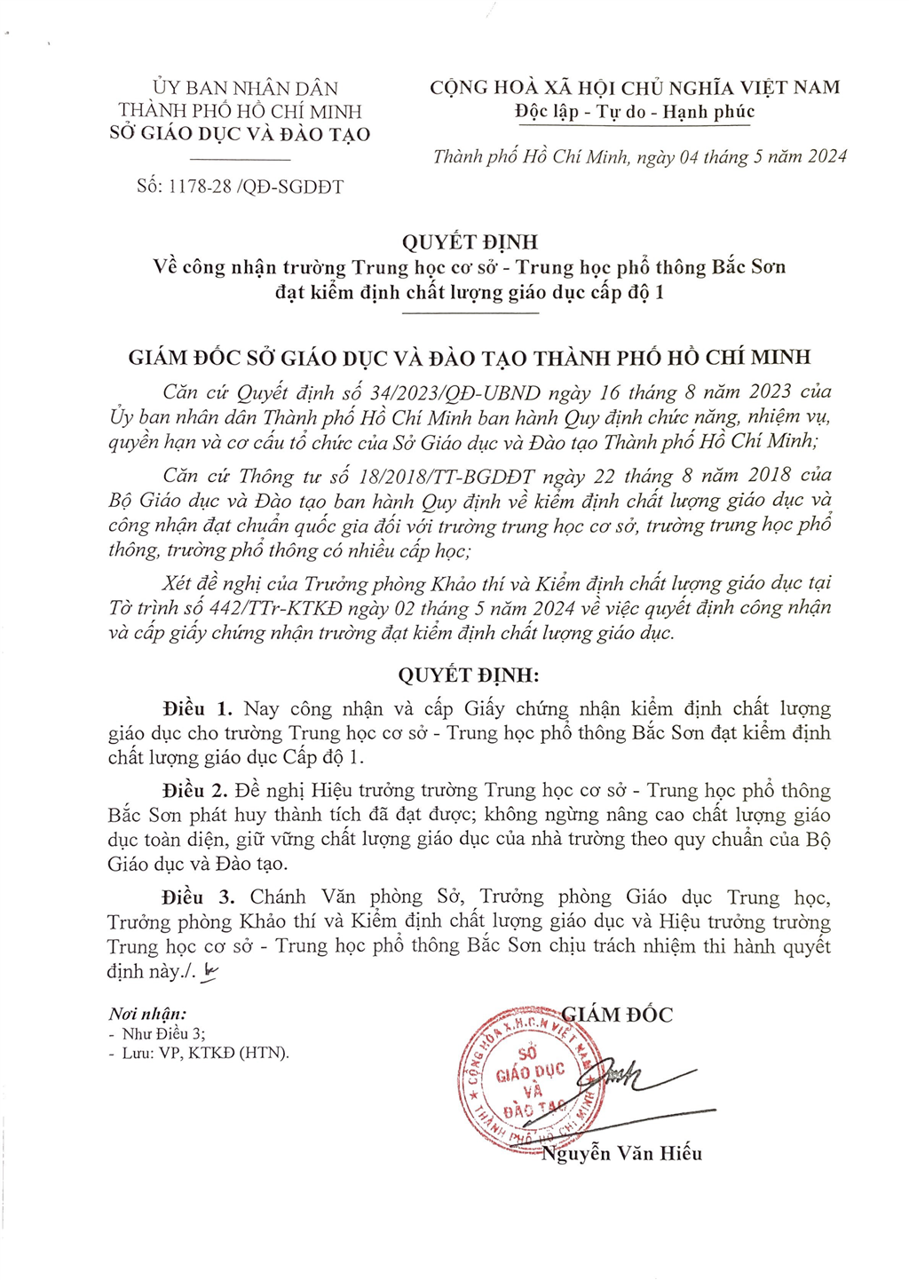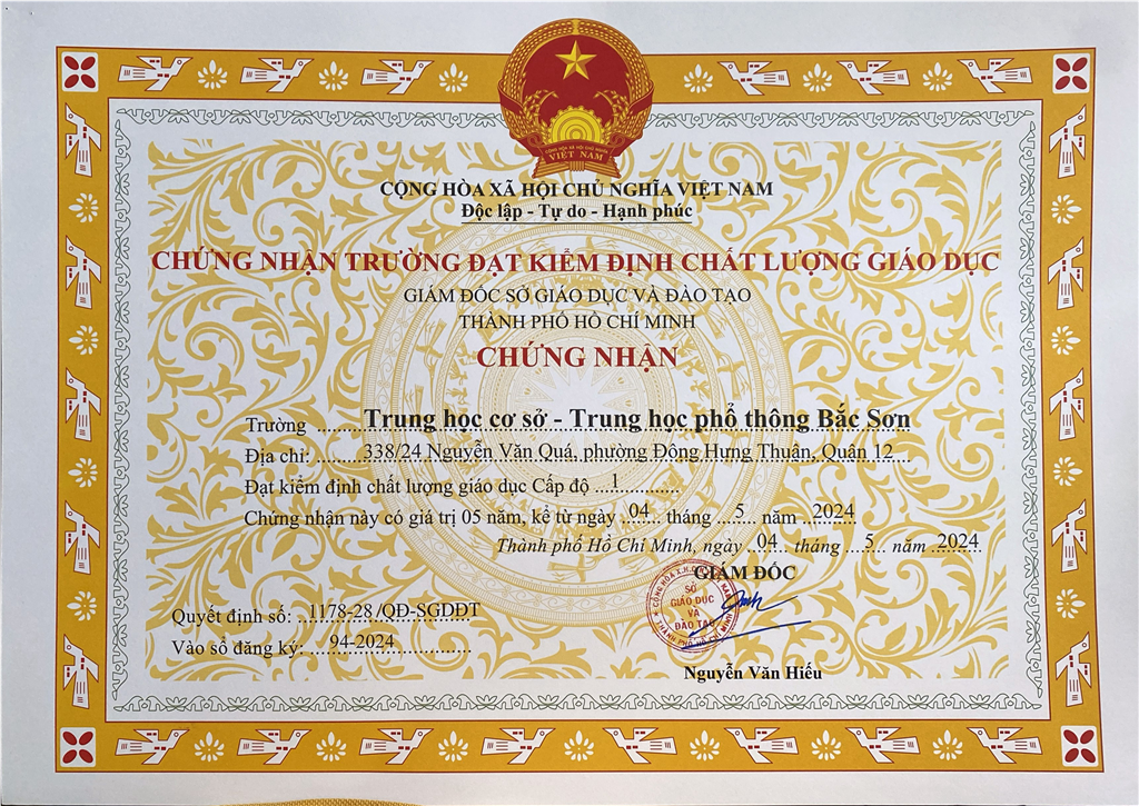 Quyết định về công nhận trường Trung học cơ sở - Trung học phổ thông Bắc Sơn đạt kiểm định chất lượng giáo dục cấp độ 1